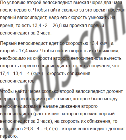 Из города выехал велосипедист со скоростью 13,4 км/ч. Через 2 ч вслед за ним выехал другой велосипедист, скорость которого 17,4 км/ч. Через сколько часов после своего выезда второй велосипедист догонит первого?