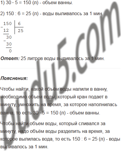Кран, который подаёт в минуту 30 л воды, за 5 мин наполнил ванну. Потом кран закрыли и открыли сливное отверстие, через которое вся вода вылилась за 6 мин. Сколько литров воды выливалось за 1 мин?