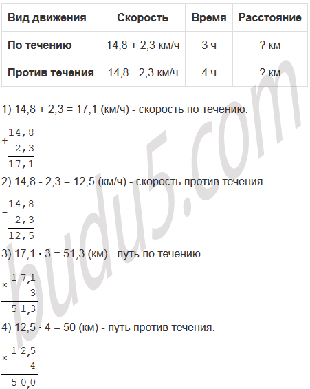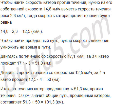 Катер, собственная скорость которого 14,8 км/ч, шел 3 ч по течению и 4 ч против течения. Какой путь проделал катер за все это время, если скорость течения 2,3 км/ч?