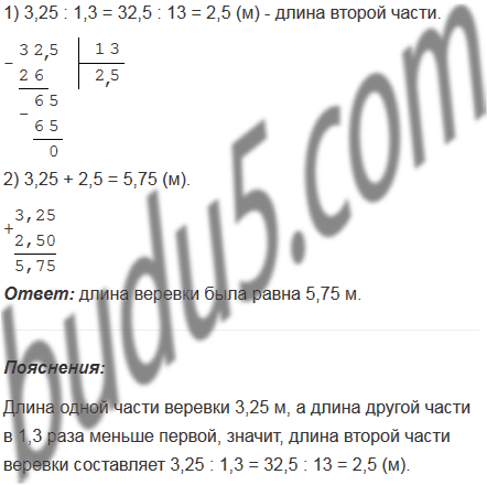 Веревку разрезали на две части. Длина одной части 3,25 м, а длина другой части в 1,3 раза меньше первой. Какова была длина веревки?