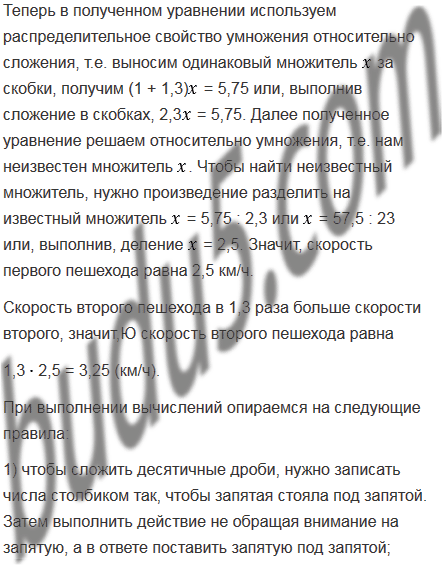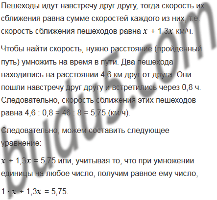Два пешехода находились на расстоянии 4,6 км друг от друга. Они пошли навстречу друг другу и встретились через 0,8 ч. Найдите скорость каждого пешехода, если скорость одного из них в 1,3 раза больше скорости другого.