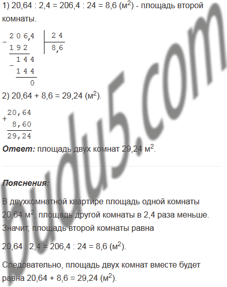 В двухкомнатной квартире площадь одной комнаты 20,64 м2, площадь другой комнаты в 2,4 раза меньше. Найдите площадь этих двух комнат вместе.