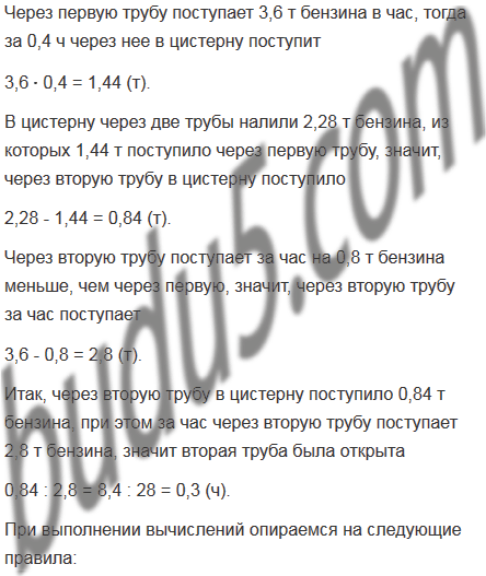 В цистерну через две трубы налили 2,28 т бензина. Через первую трубу поступало 3,6 т бензина в час, и она была открыта 0,4 ч. Через вторую трубу поступало за час на 0,8 т бензина меньше, чем через первую. Сколько времени была открыты вторая труба?