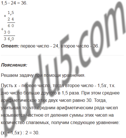 Одно число больше другого в 1,5 раза, среднее арифметическое этих двух чисел равно 30. Найдите эти числа.