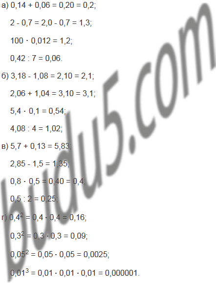 а) 0,14 + 0,06; б) 3,18 - 1,08; в) 5,7 + 0,13; г) 0,42;