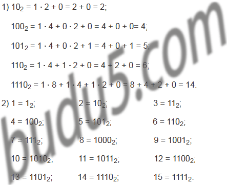 В двоичной системе счисления при записи числа используют всего две цифры: 0 и 1. Число "один" записывается, как обычно, 1, но число "два" составляет уже единицу второго разряда и поэтому записывается так: 102 "одна двойка и нуль единиц" (цифра 2, находящаяся внизу в конце записи числа, означает, что число записано в двоичной системе). Число "три" изображается 112 "одна двойка и одна единица". Число "четыре" представляет собой единицу следующего, третьего разряда и поэтому записывается так: 1002 "одна четверка, нуль двоек и нуль единиц". Таким образом, если в записи числа цифру 1 передвинуть влево на один разряд, то ее значение увеличивается вдвое (а не в десять раз, как в нашей десятичной системе). Сравните представление числа, запись которого состоит из четырех цифр 1, в виде суммы разрядных единиц в десятичной и двоичной системах: