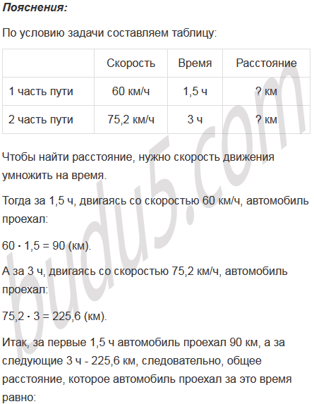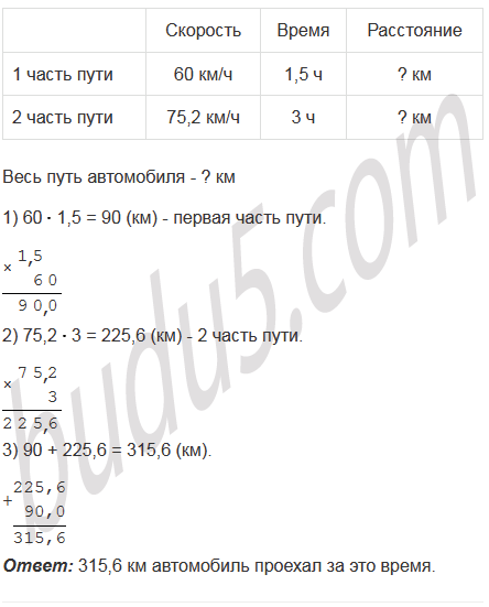 Автомобиль ехал 1,5 ч со скоростью 60 км/ч и 3 ч со скоростью 75,2 км/ч. Найдите расстояние, которое проехал автомобиль за это время.