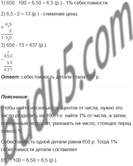 Себестоимость изготовления одной детали равна 650 р. Внедрение новой технологии позволило снизить себестоимость детали на 2%. Какова стала себестоимость детали?