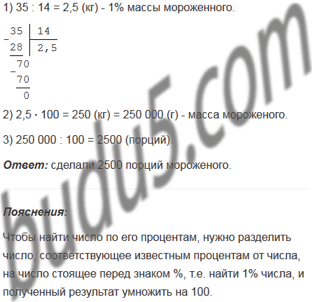 Сливочное мороженое содержит 14% сахара. На приготовление мороженого израсходовали 35 кг сахара. Сколько сделали порций мороженого, если в каждой порции 100 г?