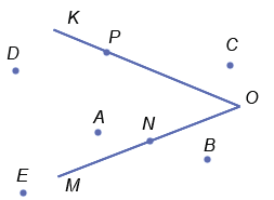 Укажите, какие точки на рисунке 76 лежат внутри угла KOM. Какие точки лежат вне этого угла? Какие точки лежат на стороне OK, а какие - на стороне OM?