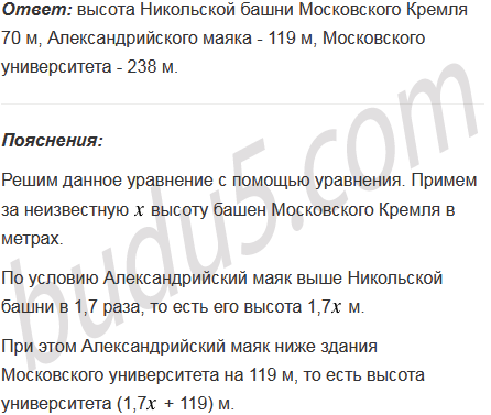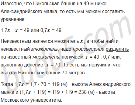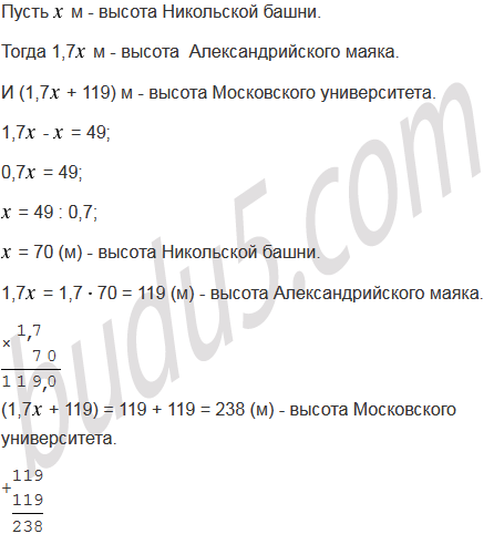 Построенный в древности Александрийский маяк, который называли одним из семи чудес света, выше Никольской башни Московского Кремля в 1,7 раза, но ниже здания Московского университета на 119 м. Найдите высоту каждого из этих сооружений, если Никольская башня на 49 м ниже Александрийского маяка.