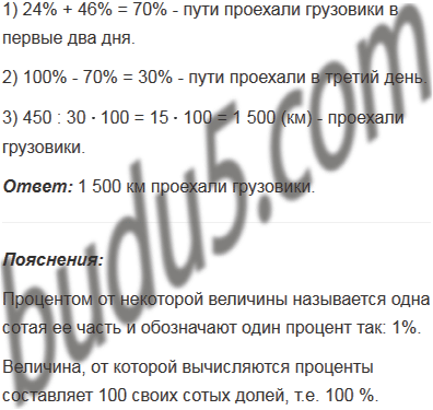 Грузовики в первый день проехали 24% намеченного пути, во второй день - 46 % пути, а в третий - остальные 450 км. Сколько километров проехали эти грузовики?