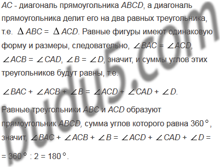 Чему равна градусная мера каждого угла прямоугольника? Чему равна сумма этих градусных мер? Чему равна сумма градусных мер углов каждого из треугольников АВС и СDА (рис. 88)?