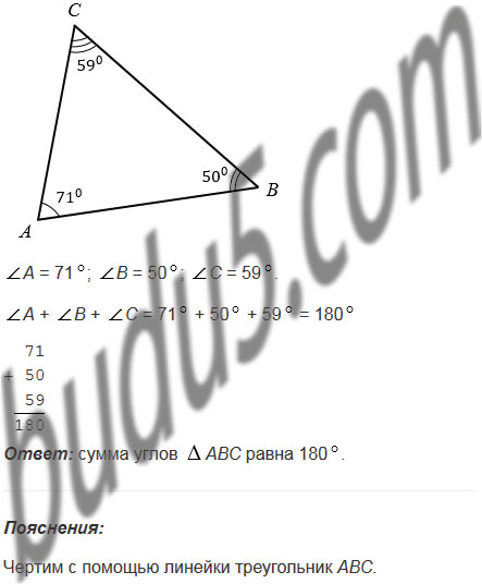 Проверьте, что сумма градусных мер углов треугольника равна 1800.