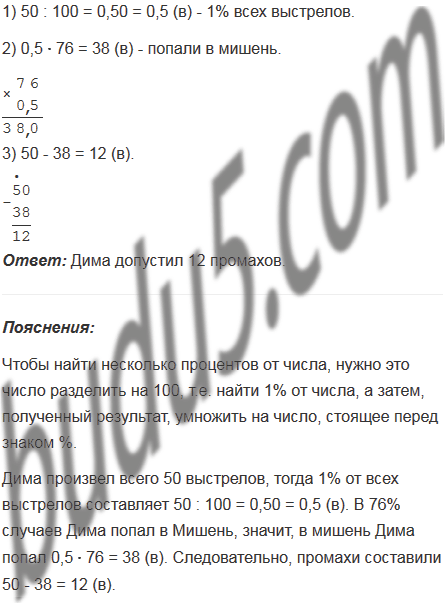 Стреляя в тире, Дима в 76% случаев попал в мишень. Сколько промахов допустил Дима, если всего он произвел 50 выстрелов?