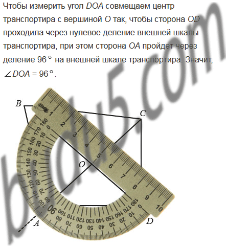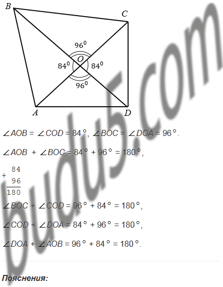 Начертите произвольный четырехугольник АВСD и проведите прямые АС и ВD. Измерьте транспортиром углы АОВ, ВОС, СОD и DОА, где О - точка пересечения прямых АС и ВD. Какие из этих углов имеют одинаковую градусную меру? Сумма градусных мер каких углов равна 1800?