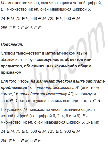 М - множество чисел, оканчивающихся четной цифрой, Е - множество чисел, оканчивающихся цифрой 5. Какому из этих множеств принадлежат числа 24, 75, 338, 725, 900, 255, 2, 5?