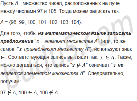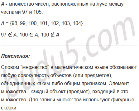 Запишите с помощью фигурных скобок множество чисел, расположенных на луче между числами 97 и 105. Какие из чисел 97, 100 и 106 не принадлежат этому множеству?