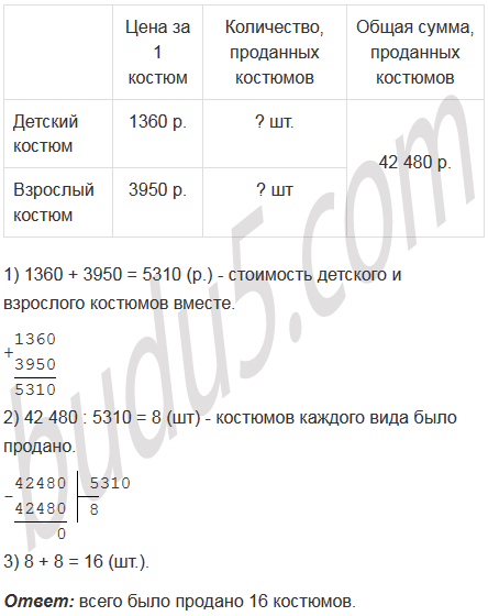Костюм для ребенка стоит 1360 р., а костюм для взрослого - 3950 р. Магазин продал костюмов на сумму 42 480 р., причем детских костюмов было продано столько же сколько продали для взрослых. Сколько было продано костюмов?