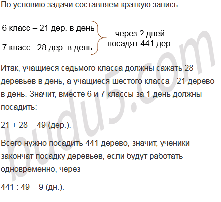 Ученики шестого и седьмого классов решили посадить вдоль дороги 441 дерево. Учащиеся седьмого класса должны сажать 28 деревьев в день, а учащиеся шестого класса - 21 дерево в день. Через сколько дней ученики закончат посадку деревьев, если будут работать одновременно?