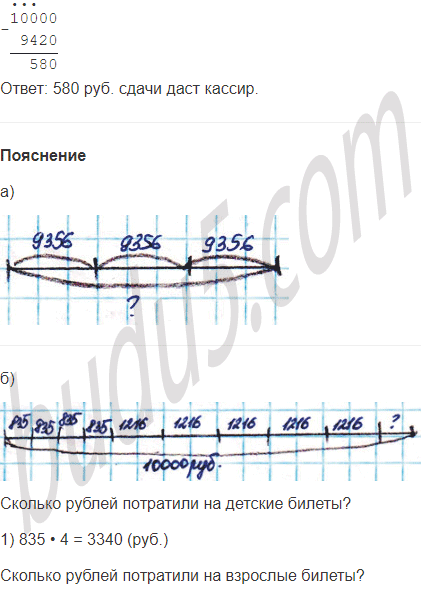 б) На экскурсию в город Суздаль купили 4 детских билета по цене 835 руб. и 5 взрослых билетов по цене 1216 руб. Сколько сдачи даст кассир, если в кассу заплатили 10000 руб.?