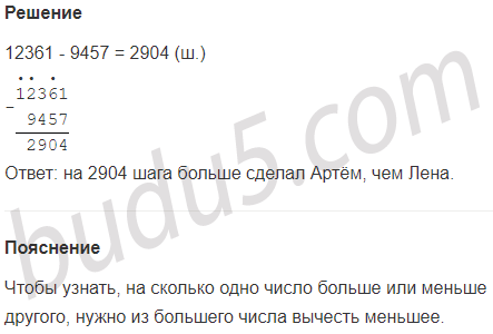 Задание № 8. Артём сделал за день 12361 шаг, а Лена - 9457 шагов. На сколько шагов больше сделал Артём, чем Лена?