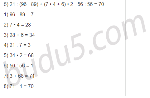 | б) 21 : (96 - 89) + (7 • 4 + 6) • 2 - 56 : 56 |