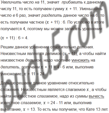 Если число лет Кати увеличить на 11 и полученный результат уменьшить в 6 раз, то будет 4. Сколько лет Кате?