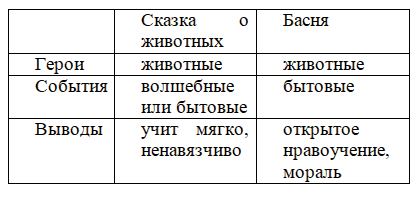 3. Сравни басню и сказку о животных. Данные занеси в таблицу.