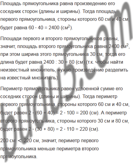 Два прямоугольника имеют одну и ту же площадь. Длина первого прямоугольника равна 0,6 м, а ширина - 4 дм. Чему равна длина второго прямоугольника, если его ширина 30 см? Найдите и сравните периметры этих прямоугольников.