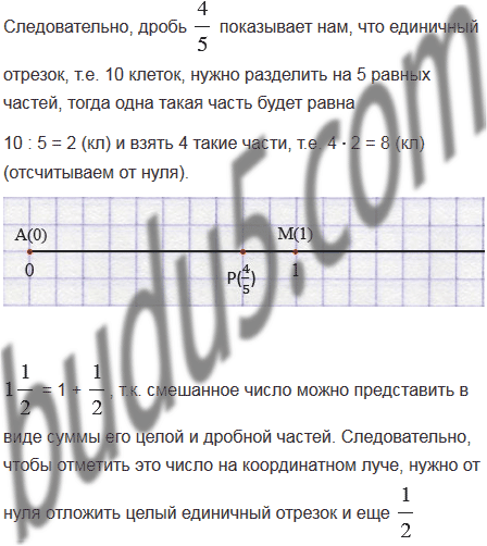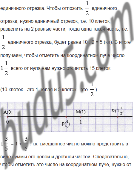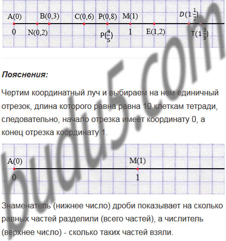 Начертите координатный луч, приняв за единичный отрезок длину 10 клеток тетради. Отметьте на этом луче точки: А(0), В(0,3), С(0,6), D(