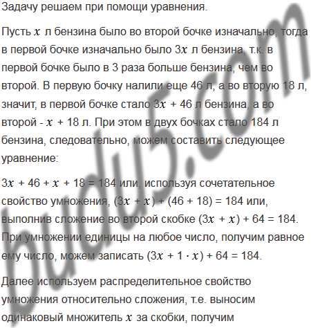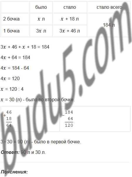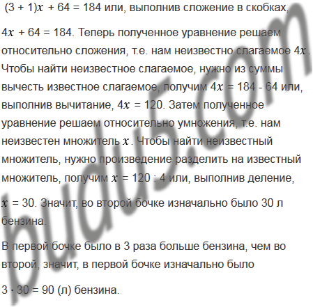 В одной бочке было в 3 раза больше бензина, чем в другой. Когда в первую налили еще 46 л, а во вторую 18 л, то в двух бочках стало 184 л бензина. Сколько литров бензина было в каждой бочке первоначально?