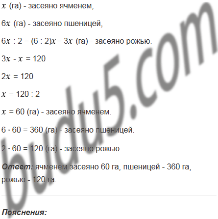 Площадь земли, засеянной пшеницей, в 6 раз больше площади, засеянной ячменем, а площадь, засеянная рожью, в 3 раза меньше, площади, засеянной пшеницей. Сколько гектаров земли засеяно каждой культурой, если рожью засеяно на 120 га больше, чем ячменем?