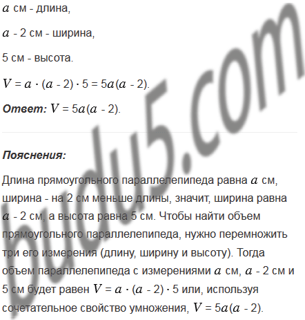 см, ширина - на 2 см меньше длины, а высота равна 5 см. Составьте выражение для нахождения объема этого параллелепипеда.