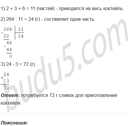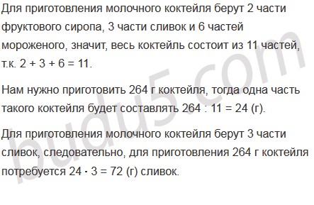 Для приготовления молочного коктейля берут 2 части фруктового сиропа, 3 части сливок и 6 частей мороженого. Сколько граммов сливок потребуется для приготовления 264 г коктейля?