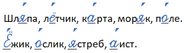 Шл_́па, л_́тчик, к_́рта, мор_́к, п_́ле, _́жик, _́слик, _́стреб, _́ист.