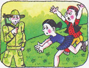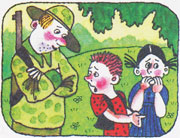Маша и Витя кинулись спасаться от страшилища. Они побросали корзины и с криками помчались прочь. На пути им встретился охотник.