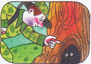 Перепуганные ребята с ужасом рассказали охотнику, что бегут от страшилища, которое сидит в дупле дерева. Попросили охотника спасти их.