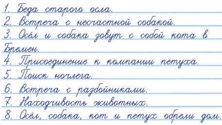 3. Животные тихо подошли к окну дома. Осёл поставил ноги на подоконник, собака взобралась на спину ослу, кот запрыгнул на спину собаки, петух взлетел на голову коту. Затем каждый из них стал громко кричать по – своему: осёл – по – ослиному, собака лаяла, кот мяукал, а петух кукарекал.