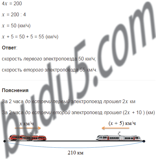 Из двух пунктов, расстояние между которыми 210 км, вышли одновременно навстречу друг другу два электропоезда. Скорость одного из них на 5 км/ч больше скорости другого. Найдите скорость каждого электропоезда, если они встретились через 2 ч после своего выхода.