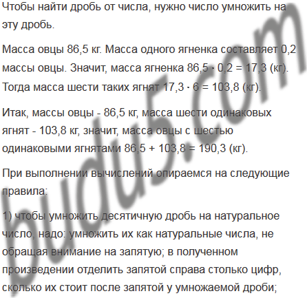 Масса овцы 86,5 кг. Масса одного ягненка составляет 0,2 массы овцы. Какова масса овцы с шестью одинаковыми ягнятами?