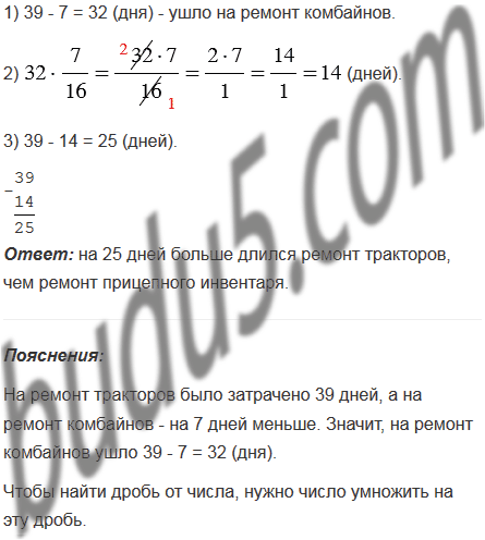 На ремонт тракторов в зимнее время было затрачено 39 дней, а на ремонт комбайнов - на 7 дней меньше. Время ремонта прицепного инвентаря составило того времени, которое ушло на ремонт комбайнов. На сколько дней больше длился ремонт тракторов, чем ремонт прицепного инвентаря?