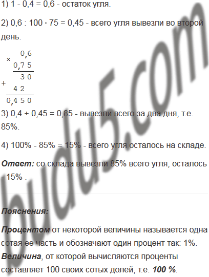 В первый день со склада вывезли 40% имевшегося там угля. Во второй день было вывезено 75% остатка. Сколько процентов всего имевшегося на складе угля вывезли во второй день? Сколько процентов всего имевшегося там угля осталось?