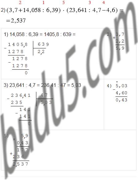 2) (3,7 + 14,058 : 6,39)(23,641 : 4,7 - 4,6).