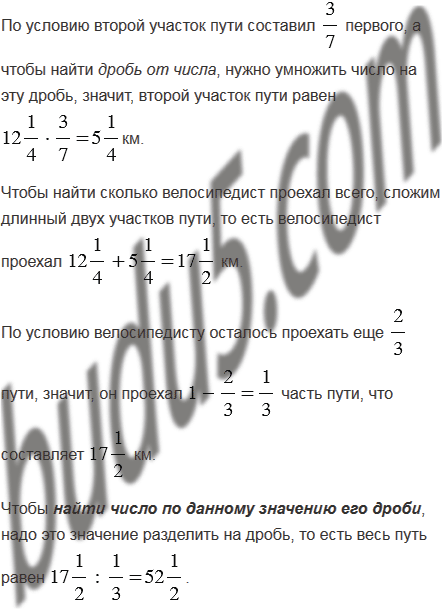 Велосипедист сначала проехал км, а потом ещё несколько километров, что составило от первого отрезка пути. После этого ему осталось проехать всего пути. Какова длина всего пути?