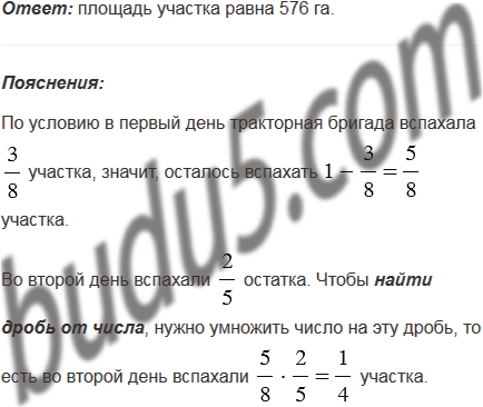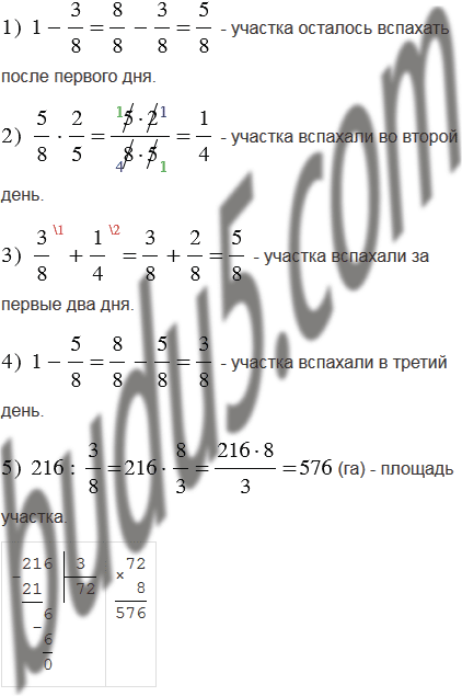 В первый день тракторная бригада вспахала участка, во второй день - остатка, а в третий день остальные 216 га. Определите площадь участка.