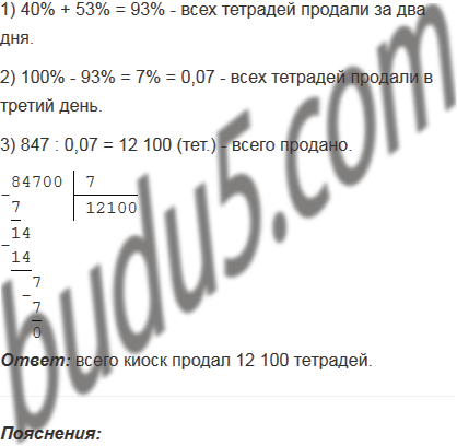 В киоске в первый день продано 40% всех тетрадей, во второй день - 53% всех тетрадей, а в третий день - остальные 847 тетрадей. Сколько тетрадей продал киоск за три дня?