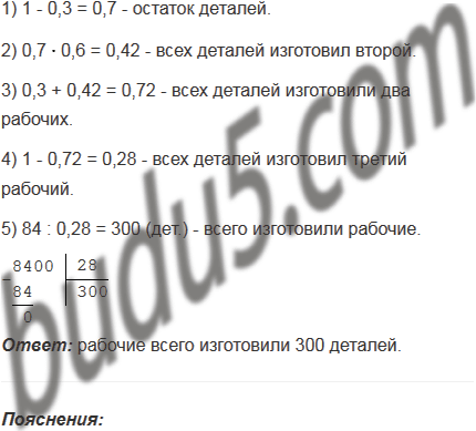 Трое рабочих изготовили некоторое число деталей. Первый рабочий изготовил 0,3 всех деталей, второй - 0,6 остатка, а третий - остальные 84 детали. Сколько всего деталей изготовили рабочие?