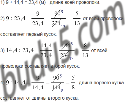 Проволока разрезана на два куска. Первый кусок имеет длину 9 м, а второй - 14,4 м. Найдите, какую часть всей проволоки составляет первый кусок; второй кусок. Какую часть длина первого куска составляет от длины второго куска?