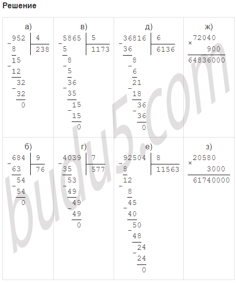 | а) 952 : 4 | в) 5865 : 5 | д) 36816 : 6 | ж) 72040 • 900 |